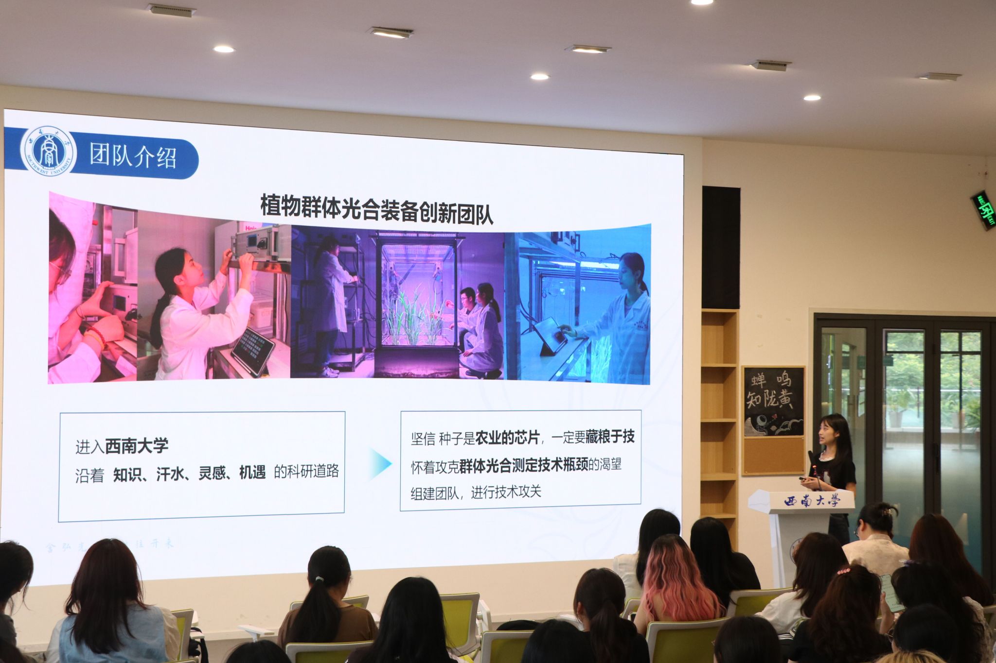 孙羽同学以“做多彩光合人,圆禾下乘凉梦”为主题,介绍了他们植物群体光合装备创新团队在研发过程中经历的困难挑战和心路历程。秉承着“躬耕田野,脚踏实地”的袁隆平精神,团队面对挑战从不畏惧,逐个击破,历时4年终于成功研发出植物群体光合全天候智能检测系统,荣获第十八届“挑战杯”全国一等奖。她向同学们展现了一个团队的力量,成员间的分工协作、路演材料的精心打磨,赛前赛中赛后的准备工作和心路历程等细节深深触动了在场的每一位同学。她总结了四个关键词:创新、团队、细节、自信,让大家受益匪浅。