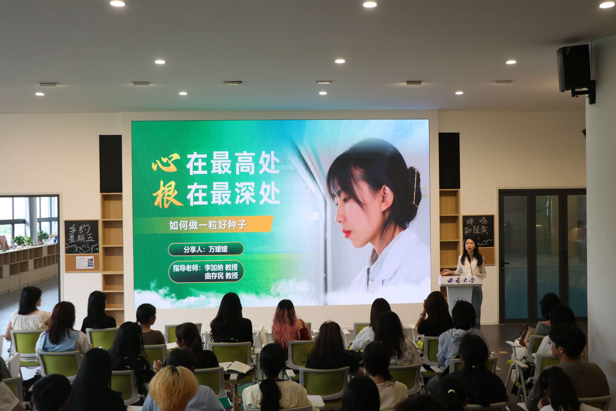 “乡约星期五”学生成长沙龙是党委学生工作部 学生工作处“助力新农科人才培养行动”的重要内容之一,旨在通过朋辈分享,增强学习动力,强化专业认同,厚植“三农”情怀。学校在每周五持续开展“乡约星期五”学生成长沙龙,由各涉农学院轮流承办,为农科学子搭建农科学子朋辈交流学习平台。
