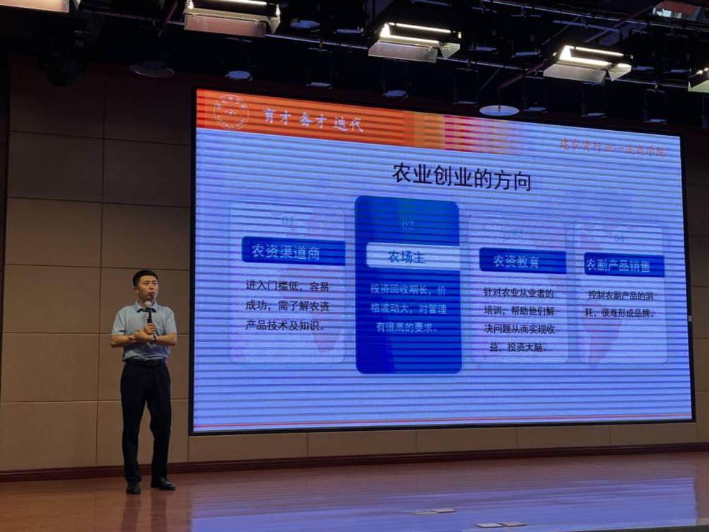 当日下午,张林飞面向 2024 级本科生作《大学生就业与创业》讲座。他结合行业数据与自身经历,解析农业岗位需求与创业方向,分析农业领域就业形势,重点解读营销、技术、研发等岗位的能力要求与职业陷阱。针对学生关心的就业选择问题,他提出“查、问、咨询”三步选企法,并以国光农化为例,展示农业企业的人才培养体系与晋升通道。在创业指导环节,张林飞阐述农业创业的四大方向(农场主、农资渠道商、农资教育、农副产品销售)及定位策略,引用杰克・特劳特“二分心智”理论,建议学生从“抢占心智空位”“重新定位竞争”等角度挖掘创业机会。他还分享费曼学习法、五项管理等快速成长工具,鼓励学生夯实专业基础,在实践中提升综合能力。