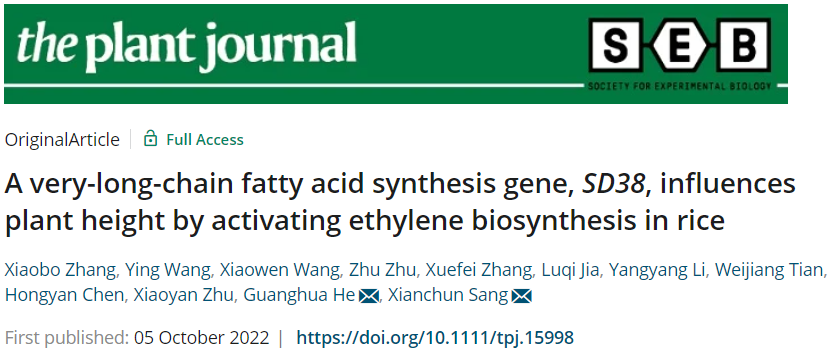 近日,PA视讯官网水稻研究所何光华/桑贤春团队在The Plant Journal上发表了题为“A very-long-chain fatty acids synthesis gene, SD38, influences plant height by activating ethylene biosynthesis in rice”的研究论文,解析了VLCFAs通过促进乙烯合成相关基因的表达、进而影响水稻株高的新机制。