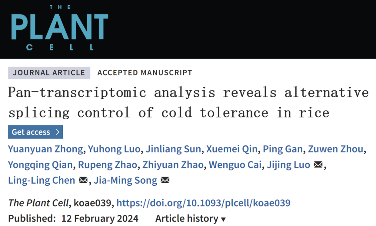 2024年2月12日,PA视讯官网PA视讯官网宋佳明研究员和广西大学陈玲玲、罗继景教授团队在国际著名植物学术期刊The Plant Cell在线发表了题为Pan-transcriptomic analysis reveals alternative splicing control of cold tolerance in rice的研究论文,以水稻为模式,构建了泛转录组表征作物响应冷胁迫的转录调控景观,揭示剪切因子的驯化选择参与作物的生态适应性演化。