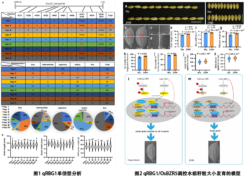 近期,PA视讯官网PA视讯官网水稻团队利用粳型亲籼SSSL-Z499图位克隆1个籼、粳亚种间粒型分化的关键基因qRBG1/OsBZR5。 在日本晴背景中含有来自籼型恢复系西恢18的稀有等位变异基因qRBG1Z的单片段代换系Z499 表现长、宽大粒;与日本晴相同的Hap I粳稻品种呈现典型的短、宽粒;与qRBG1Z序列接近的Hap V、Hap VI 和Hap Ⅳ等籼型品种呈现典型的细长粒(图1)。qRBG1为非典型的BES1/BZR1家族新成员OsBZR5,不同于水稻中已报道的OsBZR1-OsBZR4。 qRBG1缺少3个重要的保守结构域, 负调控水稻籽粒大小,而OsBZR1–OsBZR4 正调控水稻籽粒大小。通过一系列实验表明,qRBG1/OsBZR5 和 OsBZR1协同抑制 BR合成途径基因D2, 而拮抗介导BR信号途径调控籽粒大小的基因OFP1。该研究阐明了通过OsGSK2–qRBG1–OsBZR1–D2–OFP1调控水稻籽粒大小的新分子机制 (图2),为提高水稻产量提供了新途径。该研究结果在线发表在Nature Communications, 2024,15:8565. 题目“Natural variation in the promoter of qRBG1/OsBZR5 underlies enhanced rice yield”。