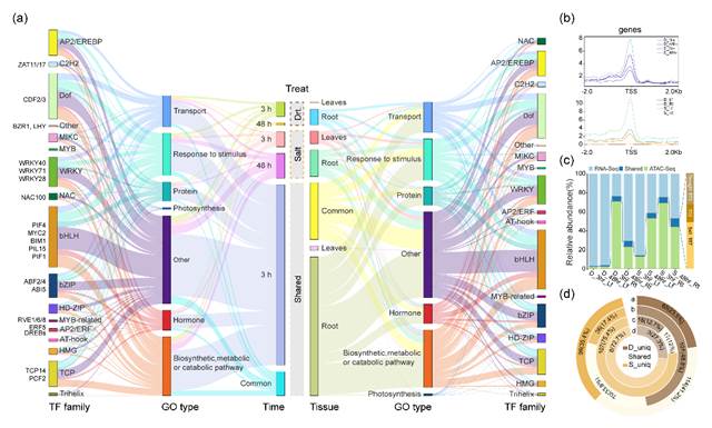 干旱和盐胁迫会严重影响马铃薯生长发育,导致产量和品质大幅降低。然而,马铃薯对盐旱胁迫的特有或共有调控网络尚未得到解析。在本研究中,团队利用ATAC-seq和RNA-seq技术联合分析了染色质可及性与基因转录表达关系,构建了不同胁迫持续时间(3 h和 48 h)、不同组织(叶片和根)以及不同胁迫(干旱和盐)之间特有和共有的转录调控网络。这是首次以不同胁迫和组织为分析点,研究马铃薯胁迫响应机制的特性与共性,为全面解析马铃薯盐旱胁迫响应机制提供了理论基础。