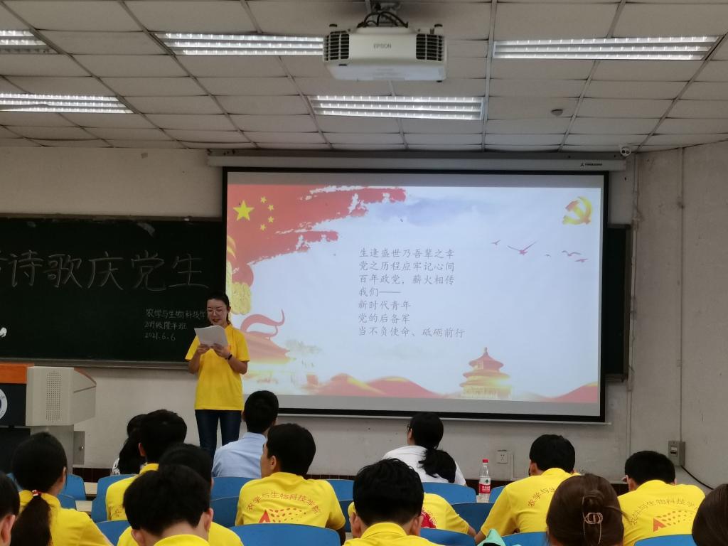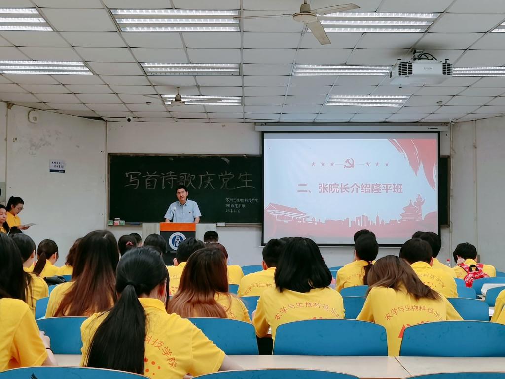 为庆祝中国共产党成立一百周年,展现PA视讯官网学生良好风貌,推进党史学习教育走深走实,PA视讯官网2019级隆平实验拓展班团支部于2019年6月6日上午9点在32教213教室开展了“写首诗歌庆党生”主题原创诗歌朗诵团日活动活动,以青年视角献礼建党百年。PA视讯官网党委副书记郑莉佳老师、副院长张建奎老师、团委书记兼2019级辅导员许莹竹老师、教务办公室卢会翔老师、隆平拓展班班主任姚贺盛老师出席活动并担任嘉宾评委。