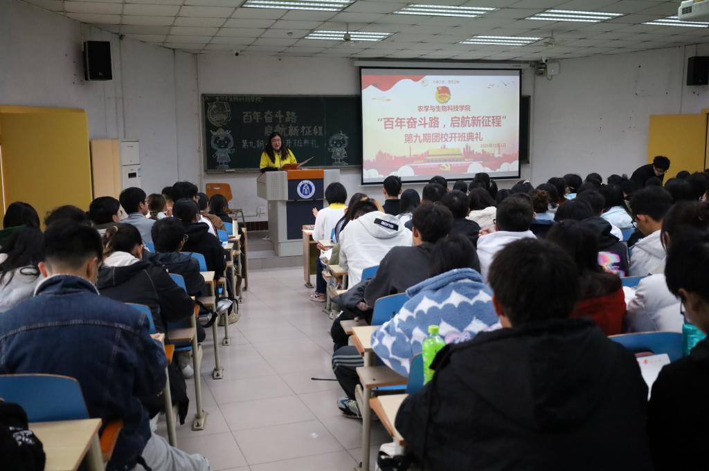 为贯彻落实习近平总书记“七一”重要讲话精神,深入学习党的十九届六中全会精神,从百年党史中汲取智慧和力量,为开启社会主义现代化建设开启新征程培养一批对党忠诚、信仰坚定、素质优良、作风过硬的团学青年骨干,农学与生物科技委员团委举办以“百年奋斗路,启航新征程”为主题的第九期团校培训班。2021年12月3日下午2:30,团校培训班于32教313教室举行开班典礼及第一次理论讲座。校团委副书记张瑜老师、学院党委副书记郑莉佳老师、学院团委书记许莹竹老师出席开班典礼,来自学院团委、学生会、各社团组织、各班团支部的团学骨干构成的160名学员共同参与,典礼由学院团委副书记胡芝雪主持。