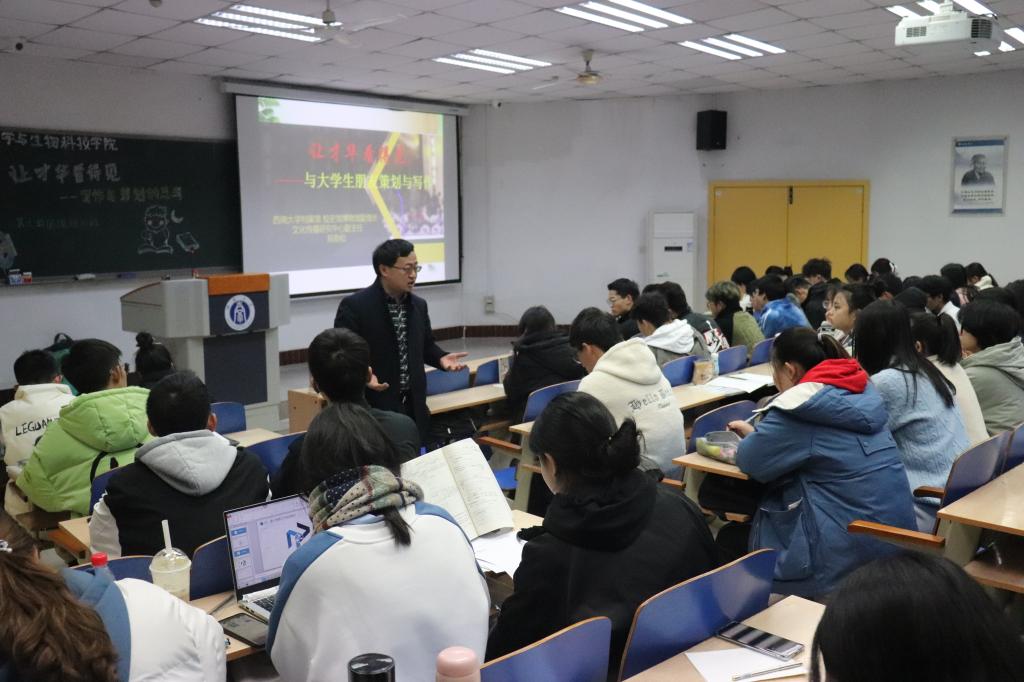 郑劲松老师兼任新闻传媒学院文化传播研究中心副主任,重庆市散文学会副馆长,重庆市委宣传部重大典型宣传教育培训中心专家组成员;承担过重庆卫视多场大型晚会策划、撰稿与培训;已发表散文、小说、诗歌300余篇(首),参编高校教材10余部;主讲《演讲与口才》《散文创作与欣赏》《民间文学》等多门课程,曾被评为PA视讯官网最受学生欢迎的十大课堂教学名师。在本次讲座中,郑劲松老师指出:写作不是把思考、思想、才华固化,是用语言、文字以及符号,以记述的方式来反映事物,表达思想感情,传递知识信息,实现交流沟通的创造性脑力劳动过程,是让才华被看见的过程。郑老师用自己学生时期如何与启蒙老师深度沟通触及心灵的经历现身说法,让同学们快速高效地学到了充满创造力的写作技巧。