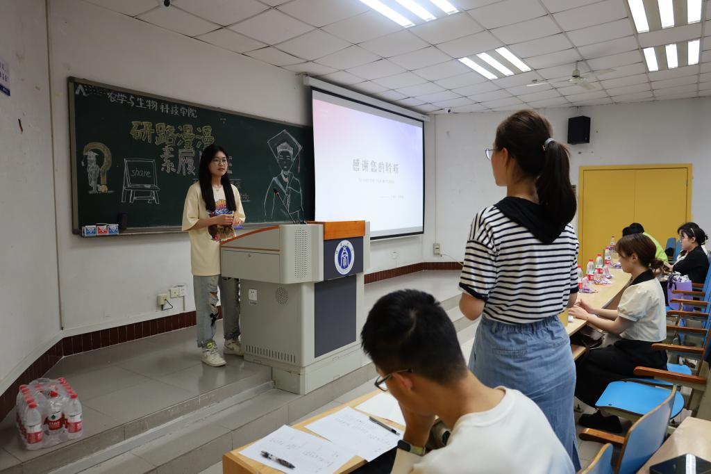 最后一位进行分享的是推免本院的胡舒婷同学,她以自己保研后的状态为切入点,分享了个人对于研究生和本科生学习目标、学习方法等差异的认识,强调了提前规划的重要性,她建议本科生要积极进入实验室,锻炼自己的科研能力。跟着导师学习、多与学长学姐交流、学习他们的实验经验,都可以成为保研准备的"加速通道"。