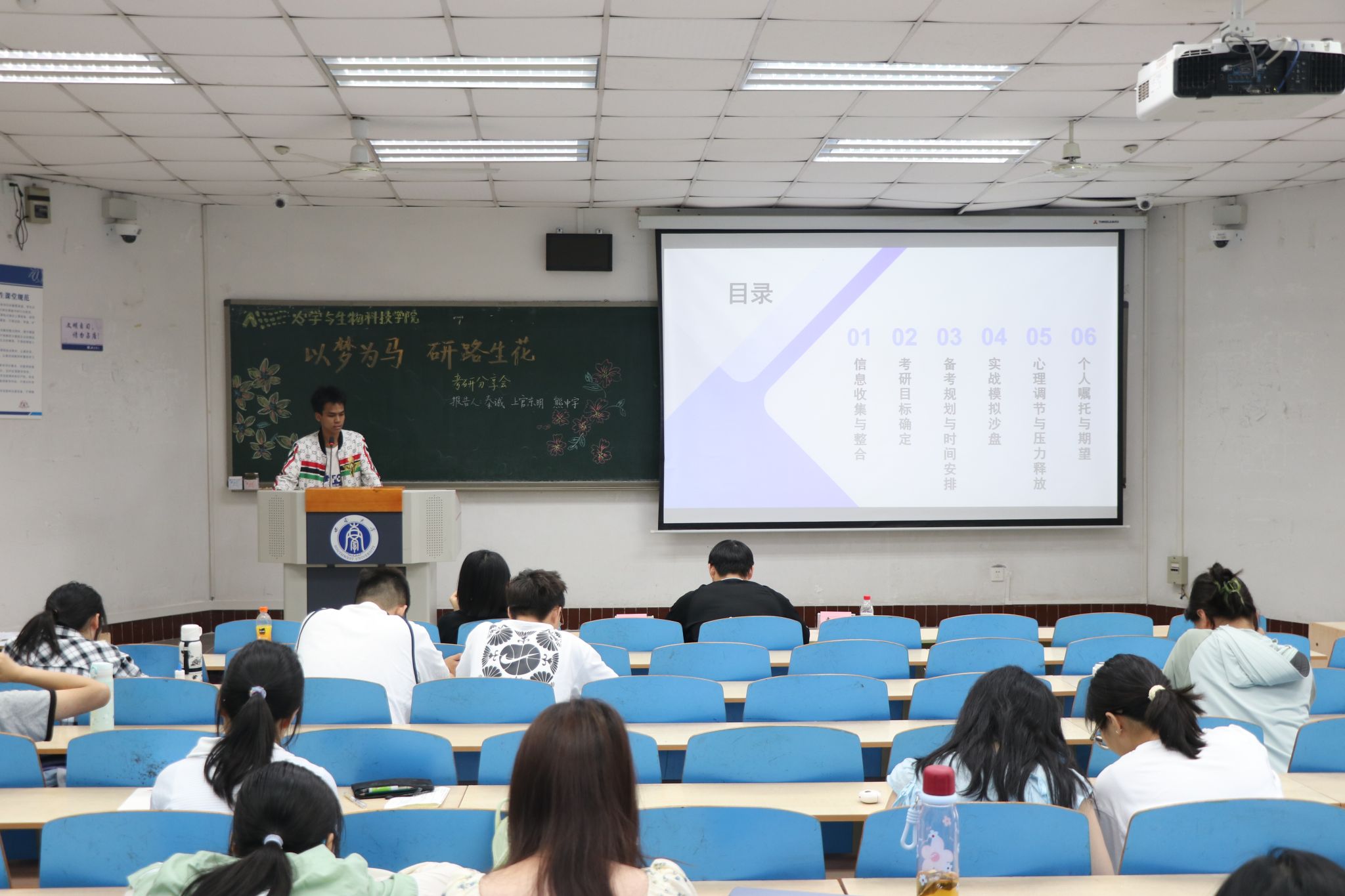 即将就读中山大学生命科学院生物信息学专业的上官东明,以“选择大于努力”为主题,建议同学们要谨慎选择考研方向,结合自身实力理性评估目标。他指出,“考研的第一步就是要端正态度”。从“联系上岸学长获取‘避雷指南’”的信息收集法,到“基础阶段稳扎稳打、强化阶段技巧赋能”的复习节奏,再到复试中“科研经历结构化展示”的突围策略,他以生动的案例向同学们层层解析备考关键节点。在答疑互动环节,上官东明同学着重强调复试阶段的展示技巧,建议同学们通过系统梳理本科阶段科研实践经历,在面试中充分展现自身竞争力与学术潜力。