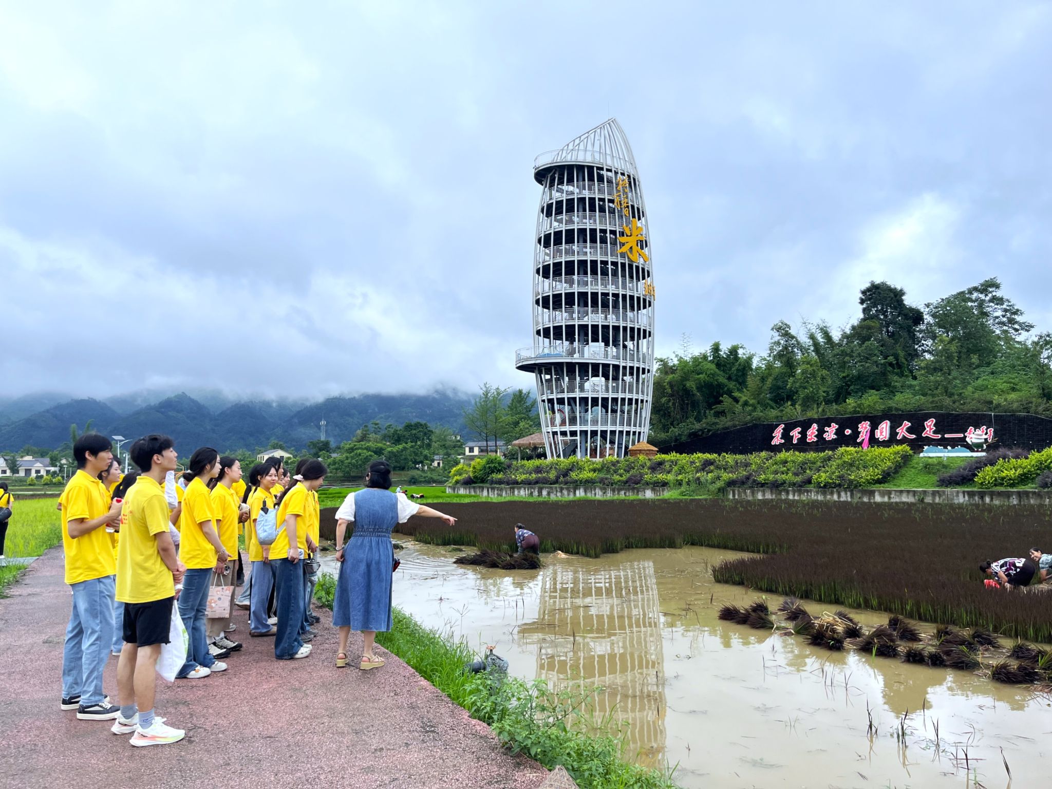 长虹村是袁隆平院士工作的首站,他在西南农学院求学时,深入大足区投身土改工作,与村民朝夕相处三个多月。这片土地不仅是他人生事业的起点,更承载着这位“杂交水稻之父”的初心与期盼。在袁隆平团队的大力支持下,当地打造“重庆隆平五彩田园景区”,发展“稻+”产业,构建起集高科农业、休闲观光、科普研学于一体的农旅文商融合生态,走出了一条特色鲜明的乡村振兴之路。实践团第一站便来到了长虹村的五彩稻田,在稻浪翻涌的画卷中感受乡村振兴的强劲脉搏,于交错纵横的田埂间领悟袁隆平科学家精神的传承与延续。
