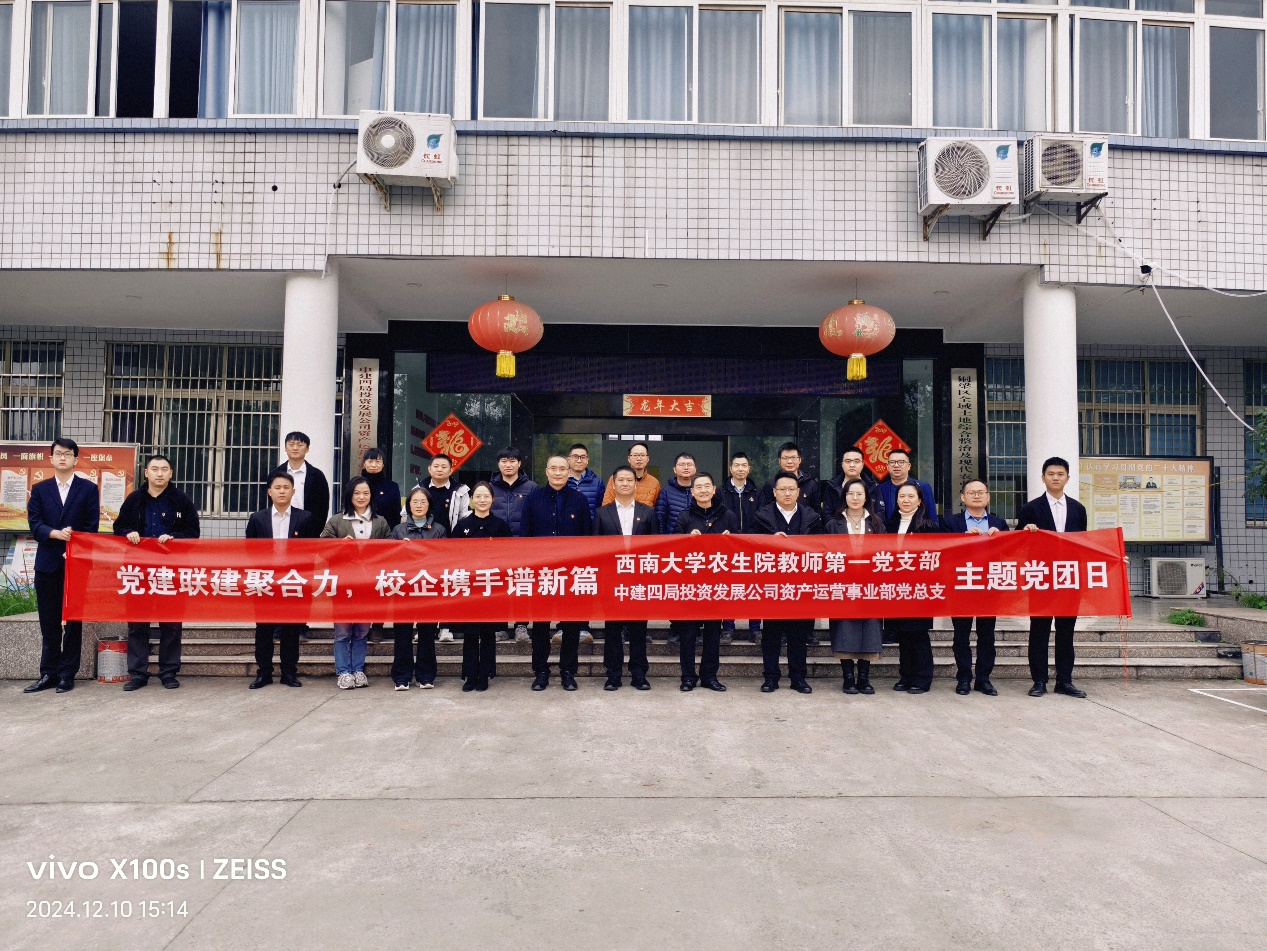 为深入贯彻并落实国家乡村振兴战略的相关决策部署,积极推动党建引领科技工作的有序进行,推进校企合作走深务实。2024年12月10日,学院党委书记阳义健带领教师第一党支部党员前往重庆市铜梁区与中建四局投资发展公司资产运营事业部党总支开展 “党建联建聚合力,校企携手谱新篇”党建联建活动,就校企合作共同促进乡村振兴主题进行了深入的交流。