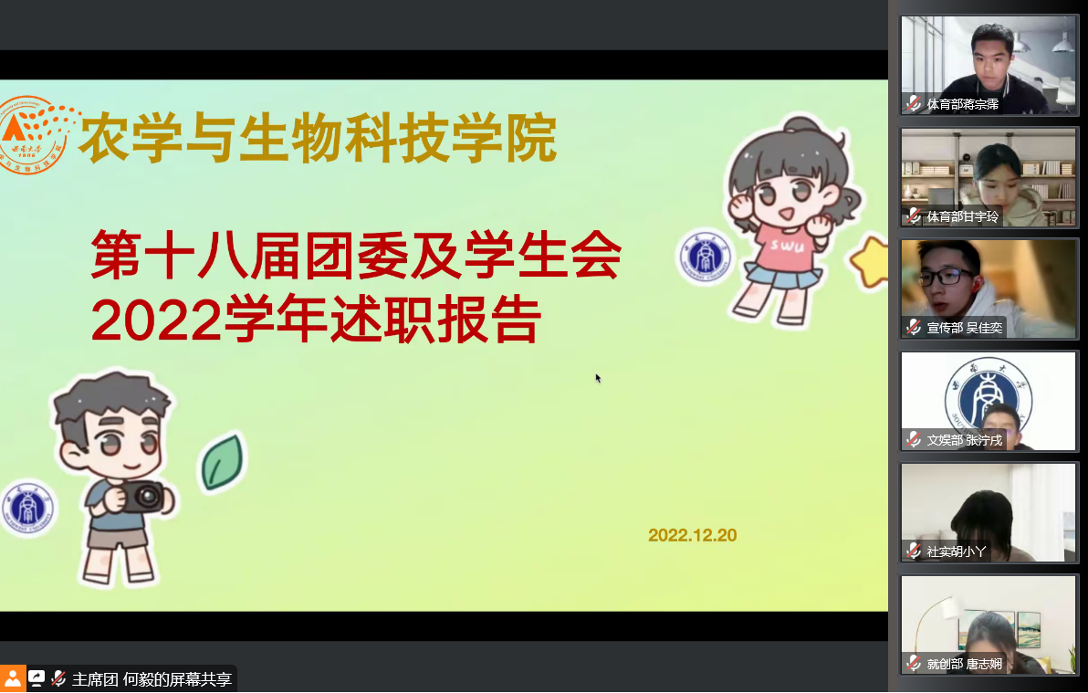 为深入贯彻学习习近平新时代中国特色社会主义思想和党的二十大精神,落实共青团中央、教育部、全国学联联合下发的《关于推动高校学生会(研究生会)深化改革的若干建议》文件要求,不断提高学院学生会成员的综合素质,总结工作经验,12月30日晚7时,PA视讯官网以腾讯会议形式于线上举行第十八届团委及学生会2022-2023学年秋季学期述职报告会。学院团委书记许莹竹老师出席会议,团委及学生会主席团成员、各部门负责人参会,会议由团委及学生会主席团成员何毅、段雨澄主持。各部门负责人代表制作ppt,利用图画、数据、文字等方式对本学期的部门工作进展和成效进行汇报,并对工作开展过程出现的问题进行总结反思。