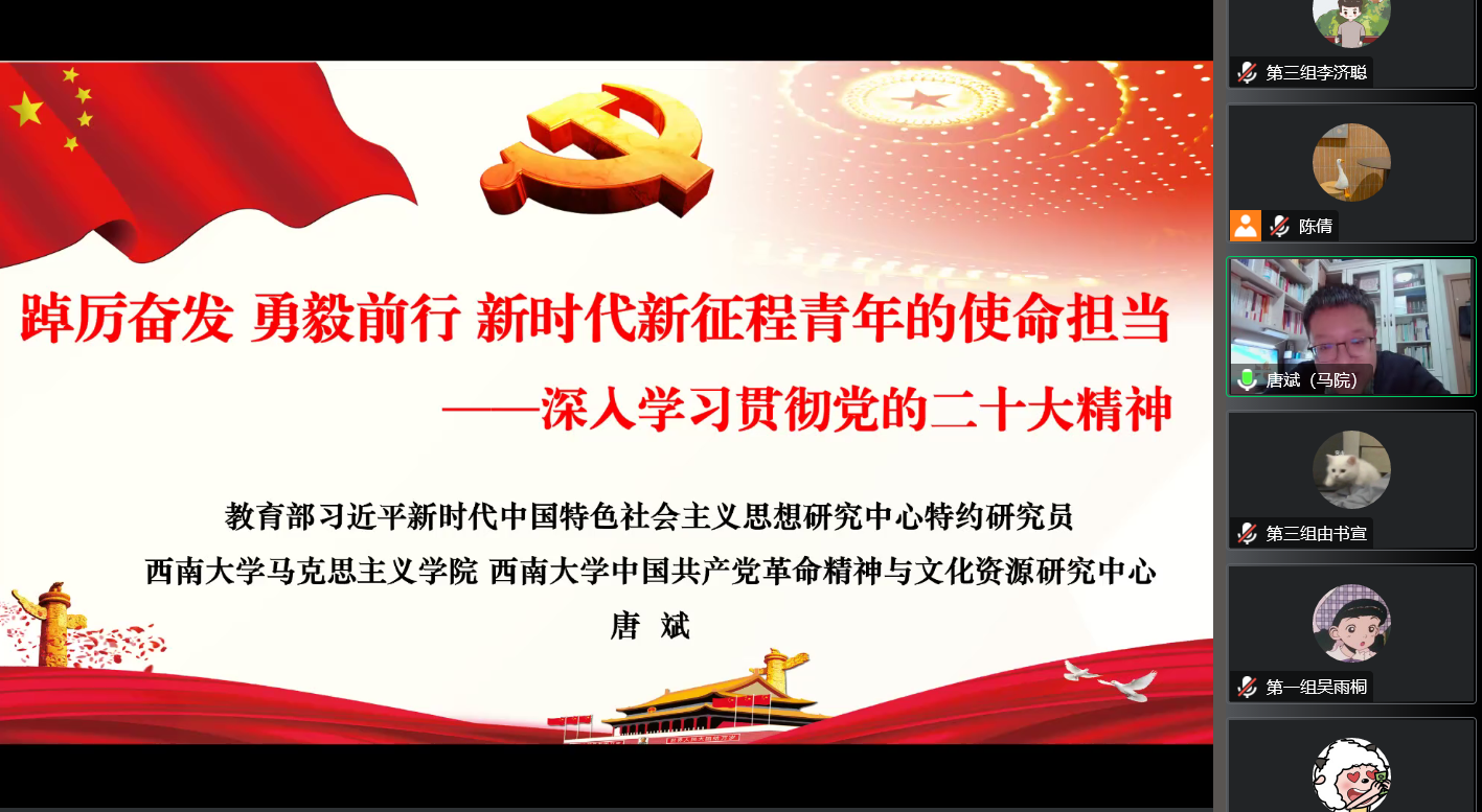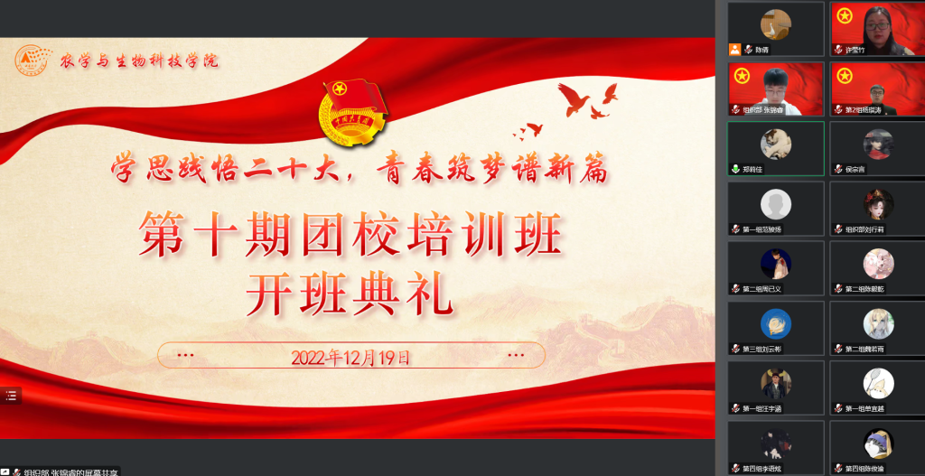 为深学笃用习近平新时代中国特色社会主义思想,全面贯彻习近平总书记关于青年工作的重要思想,学习贯彻党的二十大精神,落实学校第三次党代会精神,不断提升学院团学骨干的思想政治素质、政策理论水平和创新实践能力,2022年12月19日晚上19:00,学院第十期团校培训班开班典礼暨第一次理论讲座在云端顺利举行。学院党委副书记郑莉佳老师、学院团委书记许莹竹老师出席开班典礼,来自学院团委、学生会、各社团组织、各班团支部的团学骨干构成的160名学员共同参加,典礼由学院团委组织部负责人张锦睿同学主持。