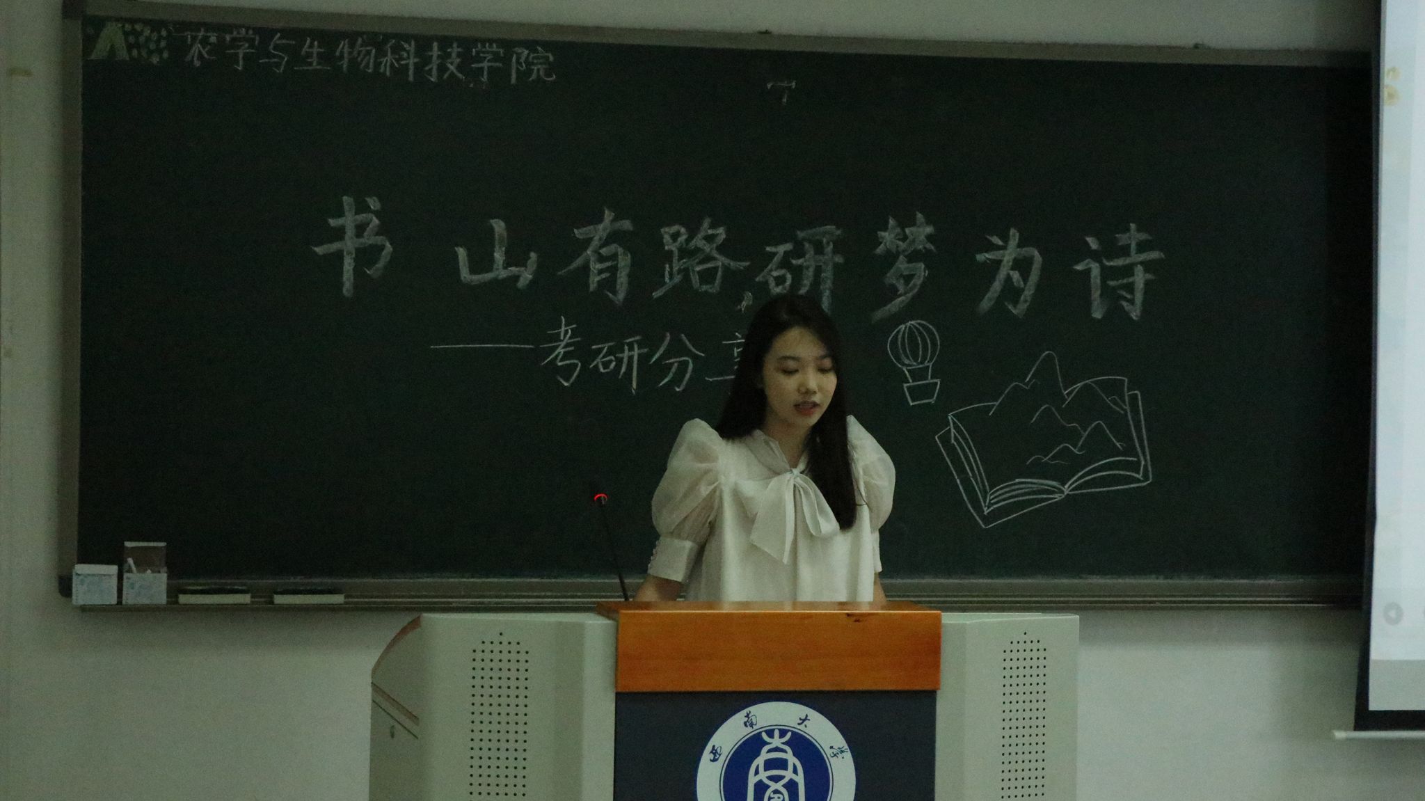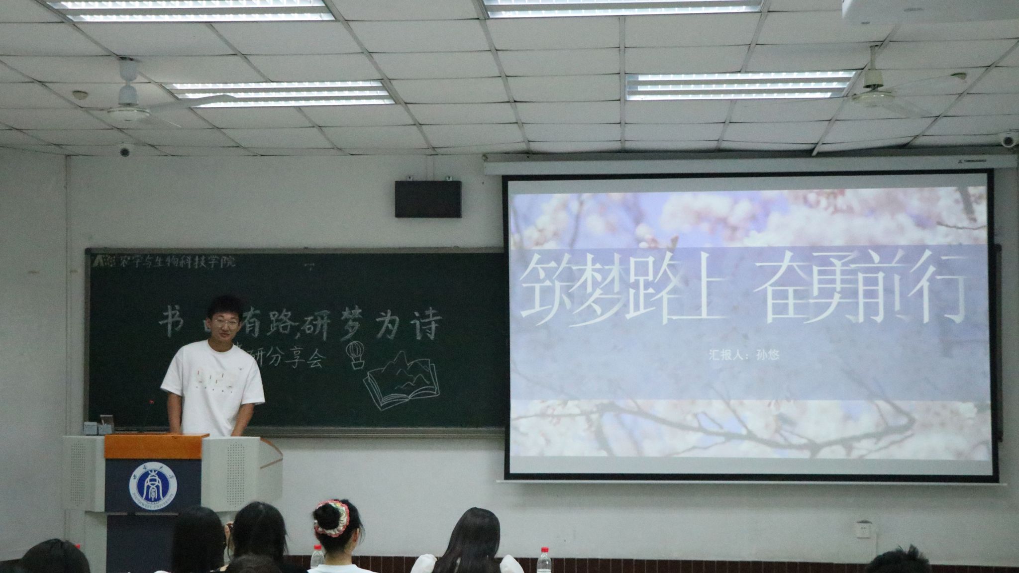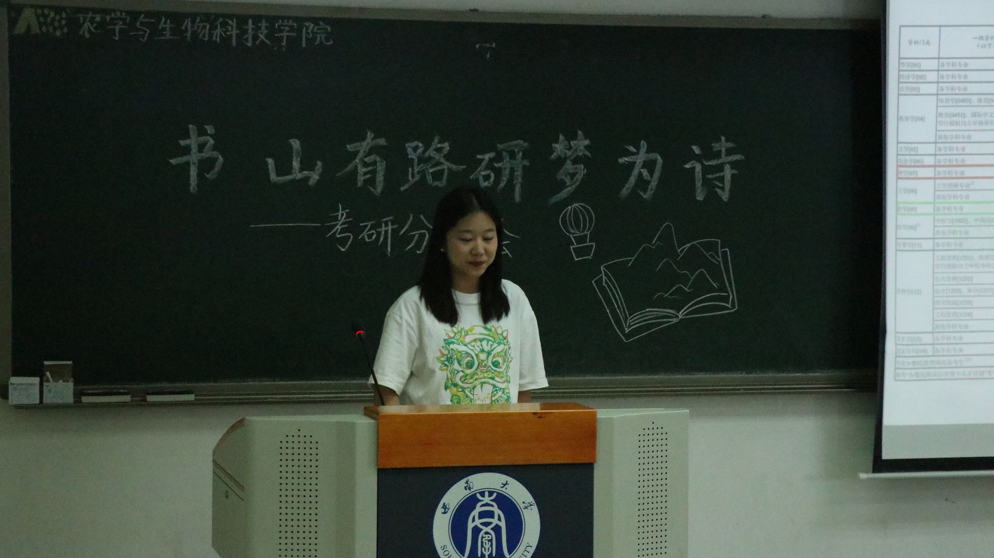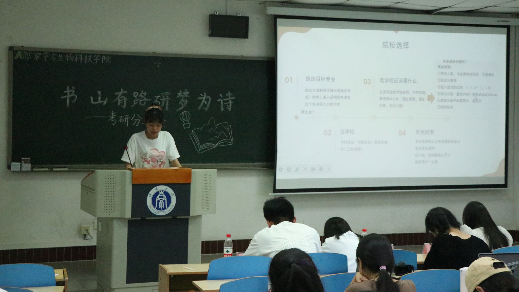 第二位是来自植物科学与技术专业的贾欣瑶同学,现已考研至西北工业大学生命学院生物技术与工程专业。她着重向同学们介绍自己备考时的学习经验,并向大家分自己使用A4纸背诵英文单词、循环记忆等高效学习方法。她指出,自主绘制思维导图能够帮助理解复杂的概念并且掌握知识之间的逻辑。同时,她还提到平时可以适当使用社交平台获取信息,但不要过度迷恋。答疑环节,她建议同学们在图书馆或自习室进行复习,可以提高学习效率。