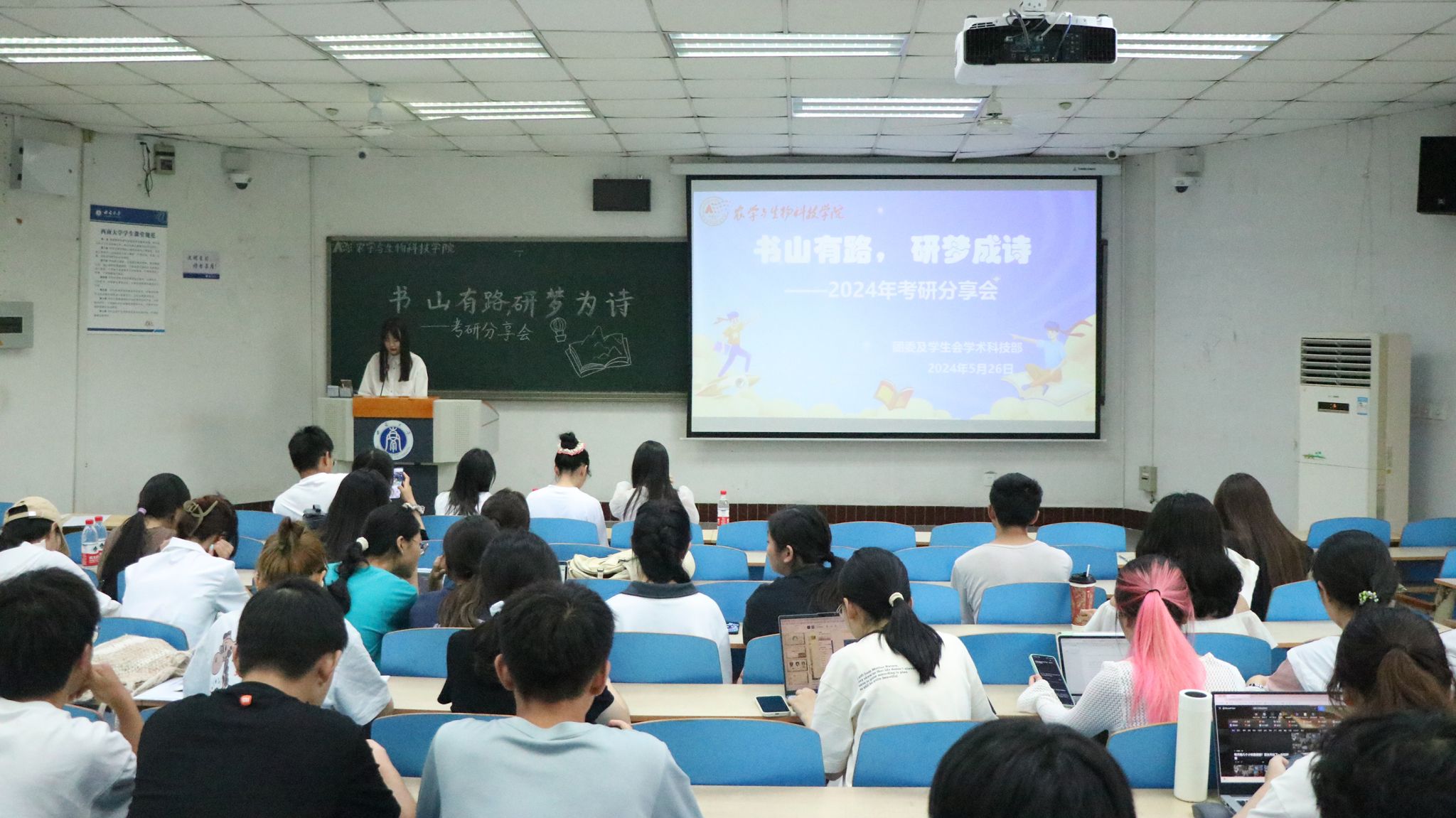 为推进学生升学深造工作,激发学院高年级同学考研热情,丰富备考经验,提高备考信心,同时帮助低年级同学打破信息壁垒,了解考研相关信息,发挥朋辈引领作用,5月26日下午,学院在32教312教室举办“书山有路,研梦为诗”考研经验分享会。会议邀请到2020级张宇丹、贾欣瑶、谭诗雨、孙悠4名优秀学长学姐为低年级同学分享备战考研过程中的宝贵经验,并解答同学们的疑惑。