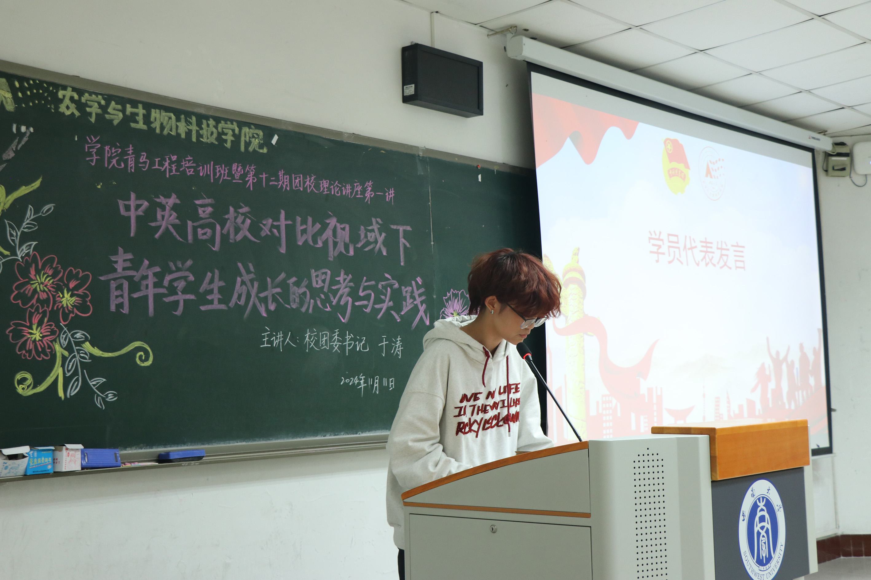 接下来,学员代表涂晨曦同学发言,她表示国家的繁荣昌盛离不开青年的努力奋斗,党始终对青年寄予厚望,作为一名共青团员,我们应时刻铭记初心与使命,用青春的臂膀扛起时代重任。团校正是我们锻炼品德意志,提高思想觉悟的课堂,带领我们学习贯彻、提升个人综合素养。她表示将以最饱满的热情、最严谨的态度、最实际的行动来完成团校课程学习,努力提高自身综合素质,努力成为学生骨干、青年先锋,在担当中历练,在尽责中成长,以实际行动践行共青团员的责任与使命。