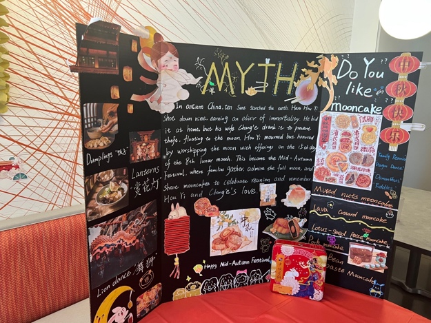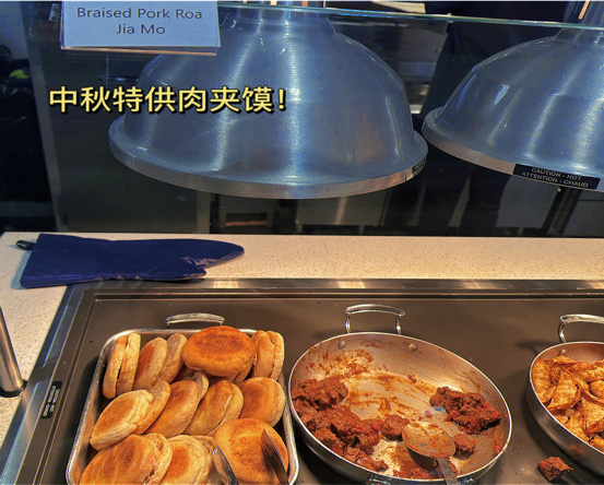 节日当天,学校食堂还精心准备了多款中国美食,包括蛋黄莲蓉月饼和肉夹馍。这些美味佳肴不仅满足了我们中国留学生的味蕾享受,也点燃了大家内心的温馨情感,让身在美国的学子们仿佛置身于故乡的怀抱。